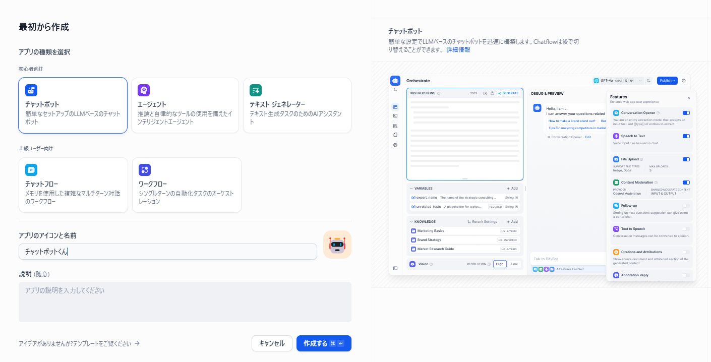 AIアプリケーションを作る上では、 最初からチャットボットやワークフローなどのひな形が用意されているので、 これを用いることでGUIで各種設定ができます。